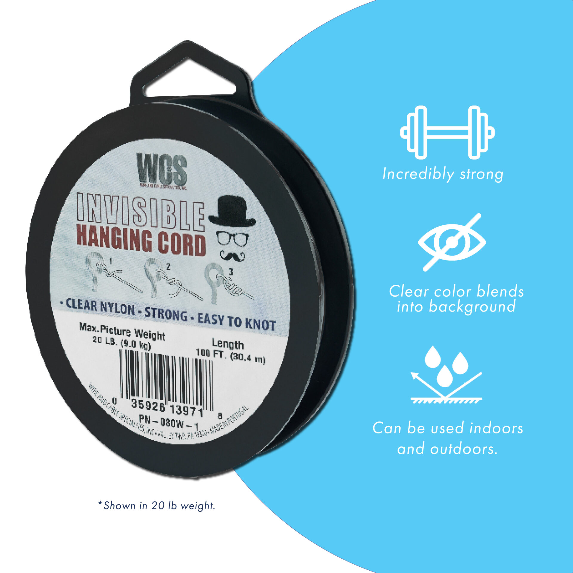 Invisible Hanging Cord, Clear Nylon, Max Picture Weight 20 lb / 9.0 kg, Approx Break Strength 80 lb / 36.2 kg, 100 ft /30.4 m