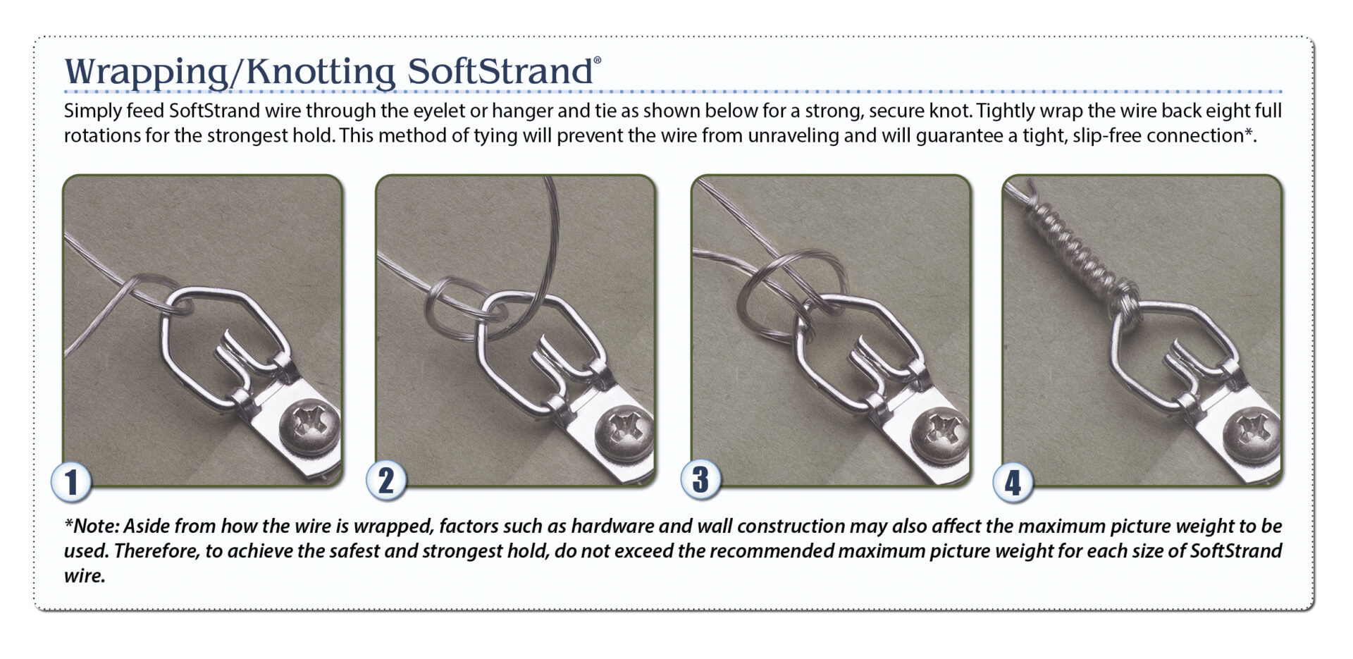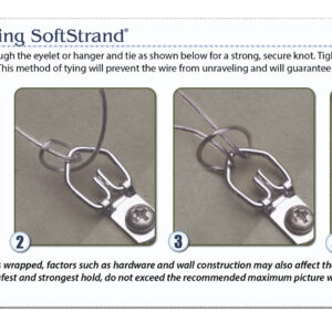 SoftStrand wires are proven to be the most ‘Finger Friendly’ wires on the market, allowing for quick and easy wire wrapping every time. Simply feed SoftStrand wire through the eyelet or hanger and tie for a strong, secure knot. Tightly wrap the wire back eight full rotations for the strongest hold. This method of tying will prevent the wire from unraveling and will guarantee a tight, slip-free connection.