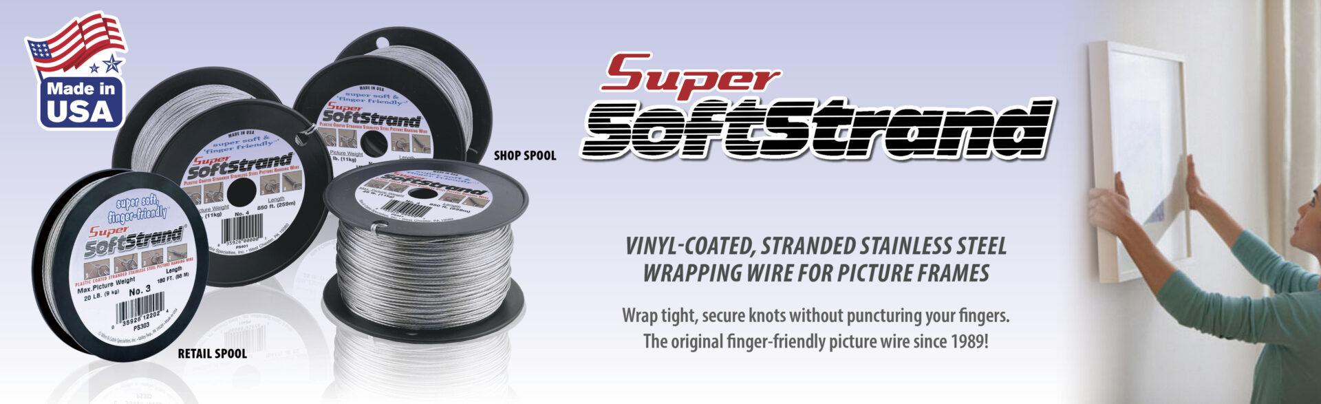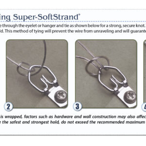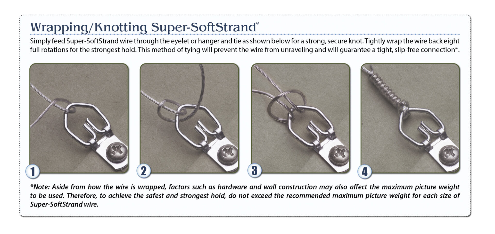 Super-SoftStrand wires are proven to be the most ‘Finger Friendly’ wires on the market, allowing for quick and easy wire wrapping every time. Simply feed Super-SoftStrand wire through the eyelet or hanger and tie for a strong, secure knot. Tightly wrap the wire back eight full rotations for the strongest hold. This method of tying will prevent the wire from unraveling and will guarantee a tight, slip-free connection.