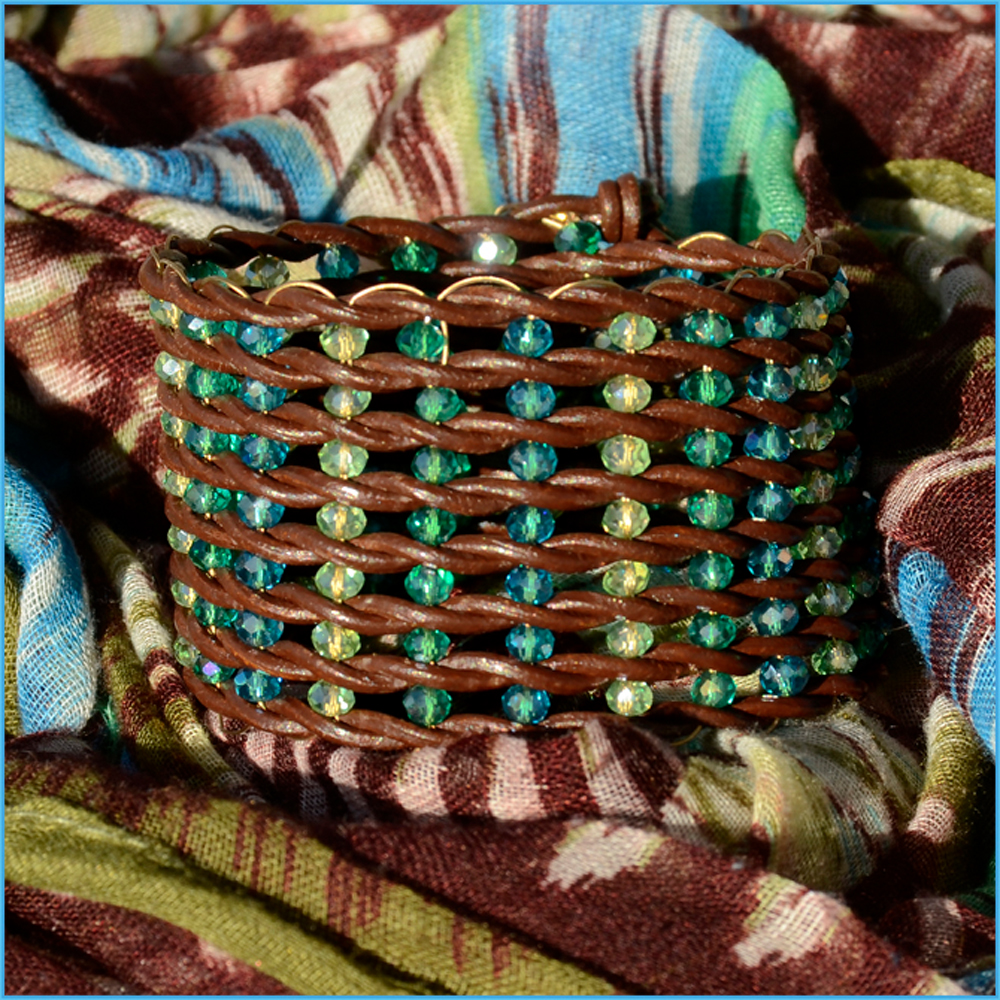 TOOLS AND MATERIALS USED: Beadalon Tools: Bangle Bracelet Weaver Tool Designer Beading Scissors Large Eye Needles Crimper Tool G-S Hypo Cement Beadalon Materials: Brown Greek Leather Gold Color Bead Stringing Wire Gold Color Crimp Tube Beads: 155 4mm Crystal Rondelle Beads INSTRUCTIONS: 1. Tie the two sections of Brown Greek Leather together with an overhand knot. Apply G-S Hypo Cement to the knot and allow it to dry. 2. Place the knot behind one of the rods on the Bangle Bracelet Weaver Tool. 3. Following the instructions included with the Bangle Bracelet Weaver Tool (Steps 2-7), weave a bracelet with the Greek Leather that is 8 wraps thick. 4. Tie an overhand knot close to the last rod and trim the ends. Apply G-S Hypo Cement to the knot and allow it to dry. 5. Slide the bracelet to the middle of the warp pins and carefully remove the tool from the base. 6. Gently separate the leather rows, creating a small space in between each row. 7. Cut approximately 8 feet of 19 Strand .38mm Gold Color Bead Stringing Wire and add a Large Eye Needle to each end. 8. Thread one end of the Bead Stringing Wire in between the woven Greek Leather next to the warp pins and add a 4mm Crystal Rondelle to the needle. 9. Continue threading the Bead Stringing Wire between the woven Greek Leather next to the warp pins, adding a 4mm Crystal Rondelle between the rows until you have reached the opposite side of the bracelet. 10. Pick up both ends of the Bead Stringing Wire and center the bracelet on the wire. 11. Thread one wire from one side and the other wire from the other side so that the weft wires cross inside the next space created between the woven wire and warp pin, adding crystals between the rows as you work. 12. Follow the instructions included with the Bangle Bracelet Weaver Tool (Steps 16-25) to complete the bracelet.